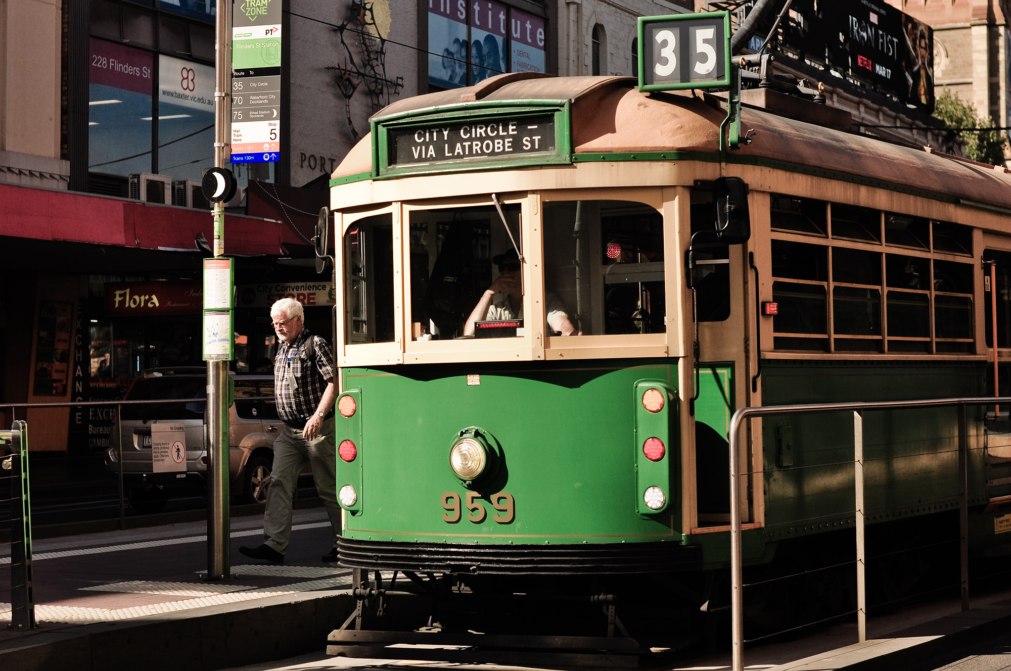 Ngày đầu tiên, mình liên hệ với Mai để tham khảo về lịch trình. Mai là học viên cũ của mình đang du học tại Úc ngành Marketing. Định hẹn gặp luôn hôm nay nhưng cô nàng lại bận đi làm mất tiêu nên tụi mình đành hẹn sang ngày hôm sau. Tự nhiên trong cái nắng rực rỡ thế này, mình lại muốn ra biển thế… Mai nghe vậy đã tư vấn cho mình tới St Kilda Beach. Nghe nói bãi biển ở đây buổi sáng rất vắng vẻ và yên bình, lại có thể nhìn thấy thuyền buồm sau ánh bình minh,… nghe vậy thôi mình đã thấy rất hứng thú rồi. Lúc ấy là 2 giờ chiều, nhanh chân chạy vào mua một cốc trà sữa tiếp năng lượng rồi hít một hơi, mình di chuyển ra khỏi sân ga, bước xuống mấy bậc thang màu xanh lá và chính thức đặt chân trên đường phố Melbourne, hòa lẫn với dòng người và bắt đầu học cách bắt TRAM.