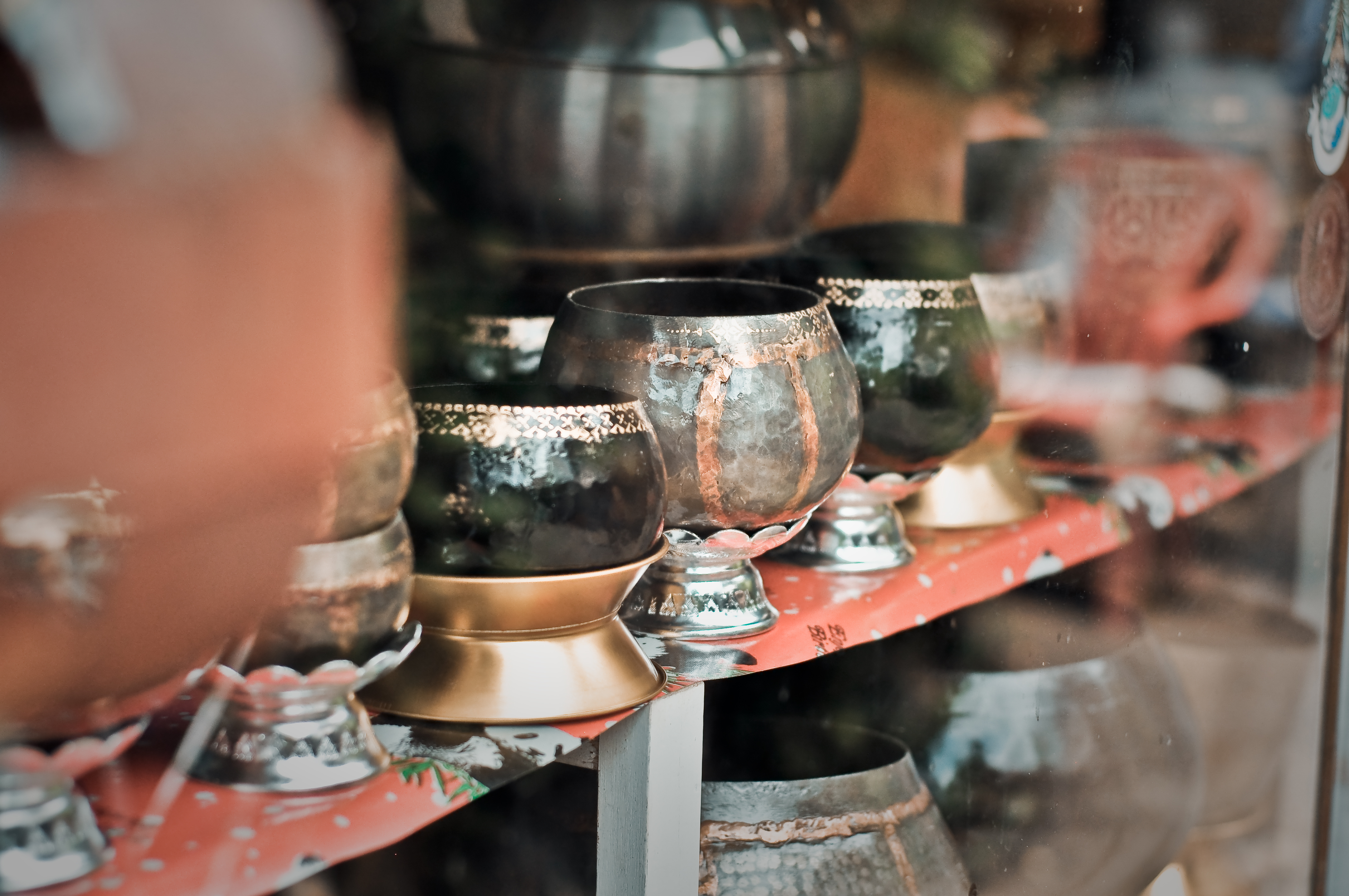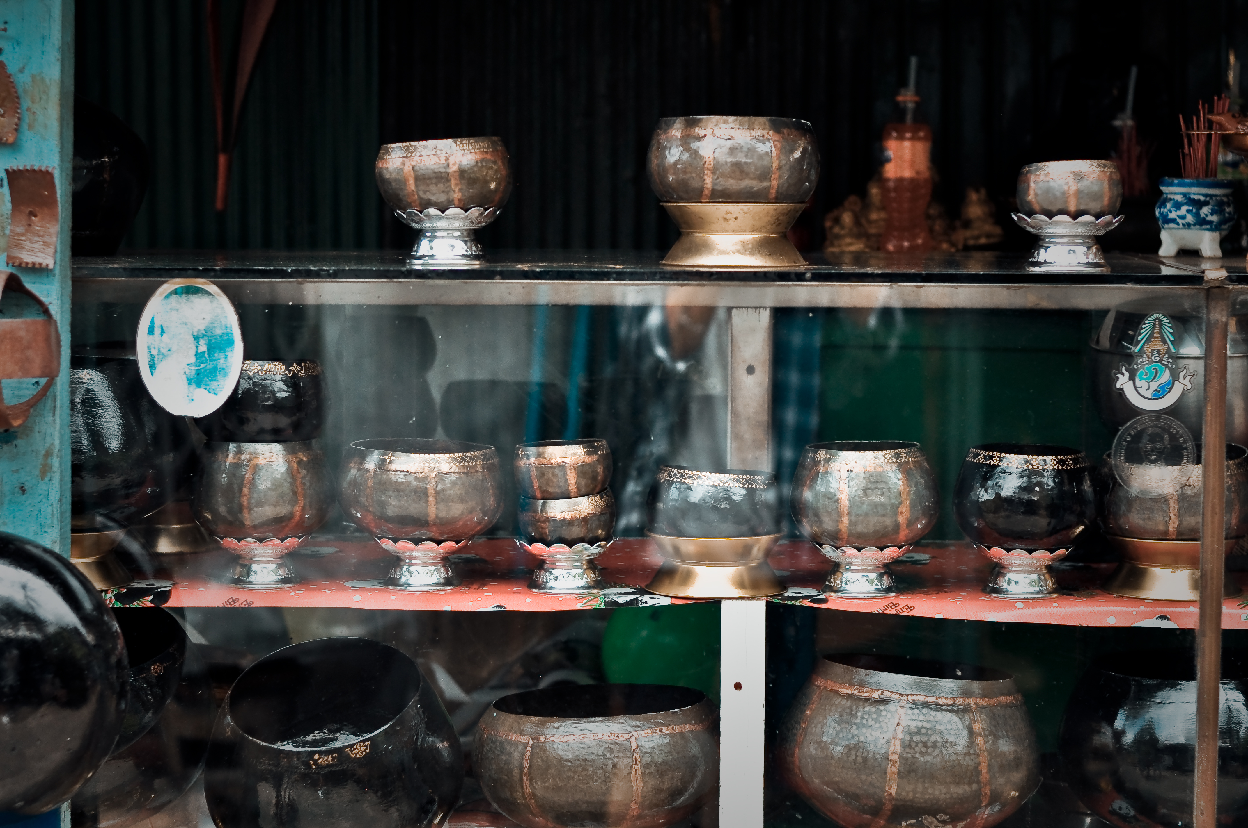 Ban Baat Village là một nơi như thế. Ngôi làng thực tế là một con hẻm nhỏ chọn cách len lỏi giữa những sáng tối chênh vênh. Chỉ mất 150 đến 200Bath cho một chuyến tuktuk, bạn đã có thể tới địa điểm này để sẵn sàng cho những trải nghiệm thú vị. Ẩn sau vẻ đen đúa cũ kĩ của những mái hiên inox lô nhô chìa ra là cả một câu chuyện chưa kể về một làng nghề gắn liền với văn hóa Phật Giáo của đất nước Chùa Vàng. Trời nắng nhẹ sau một cơn mưa bụi lúc sáng sớm dải những tia nắng vàng hoe xuyên qua mái tôn in lên mặt đường những vệt ngang xộc xệch. Chúng tôi men theo tấm biển chỉ dẫn đi sâu vào trong, hai bên con hẻm là hàng tủ kính bày những chiếc bát bình bằng đồng xinh xắn với đủ hình thù, kích thước, một vài tờ báo cũ kĩ có vẻ đã được chụp từ lâu lắm rồi, trên đó có hình một ông lão miệng móm mém cười rất duyên. Và sao nhỉ, từ đầu con hẻm tôi đã bị những âm thanh leng keng, chát chát của tiếng búa đập gõ vào kim loại lôi cuốn. Cả không gian phủ lấp một vẻ hoài cổ, rất thơ.