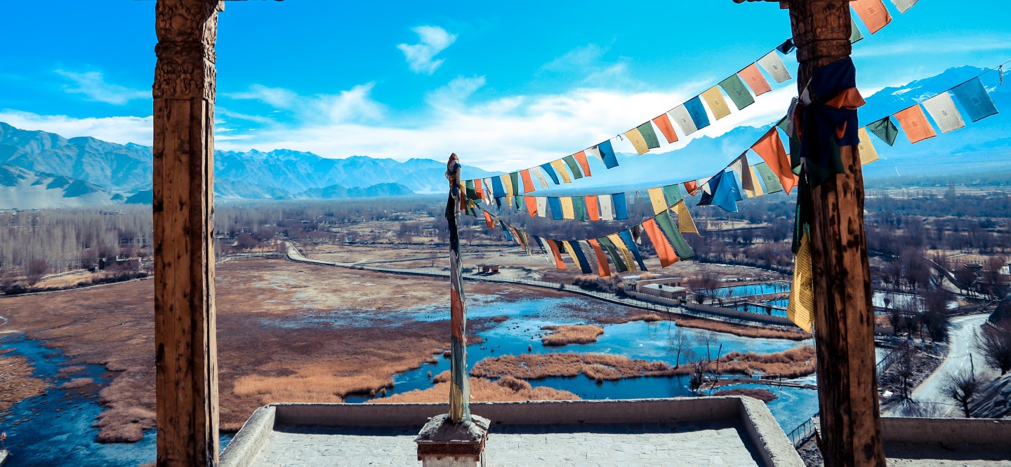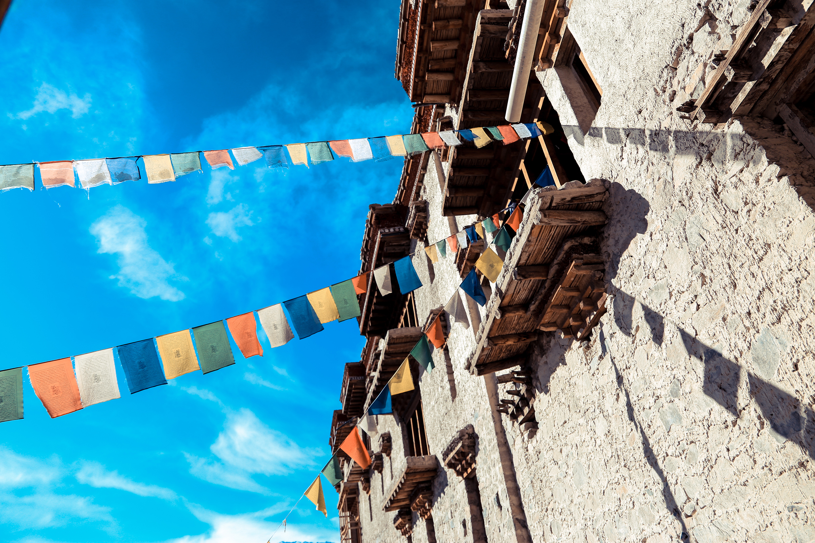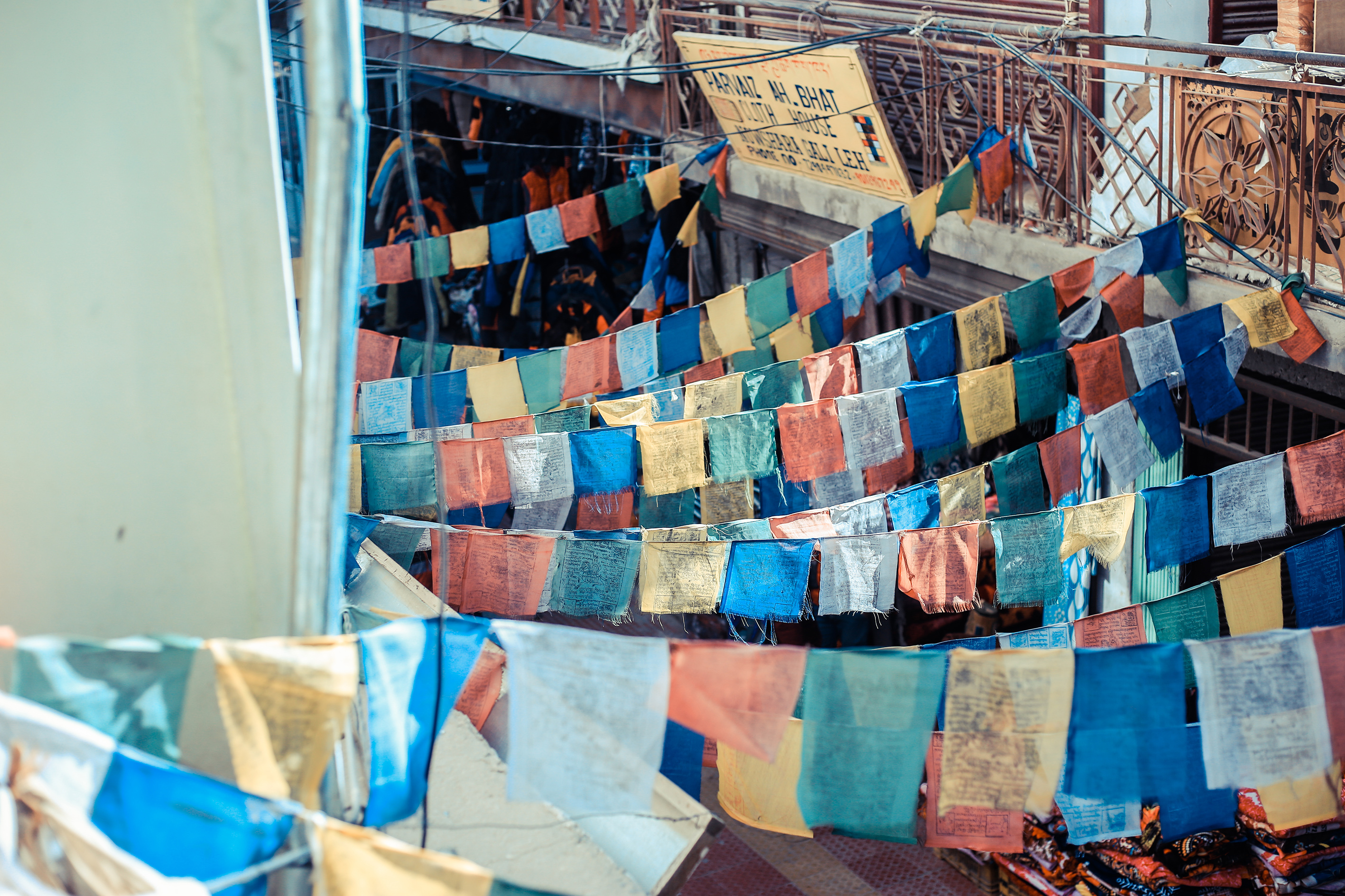 Kể từ lần đầu tiên biết về lá cờ Lung Ta tôi đã khát khao một lần được tận mắt trông thấy nó, được chạm vào nó. Với người dân ở đây, những lá cờ Lung Ta đủ màu mang ý nghĩa về sự bảo vệ, mang đến bình an và may mắn cho cuộc sống. Đấy là lý do mà người ta gọi Lung Ta là cờ nguyện. Nhìn từ xa, tưởng đâu Lung Ta chỉ là mấy tấm vải nhuộm màu sặc sỡ, nhìn gần mới thấy mỗi lá cờ đều chất chứa rất nhiều lời nguyện được viết, vẽ và in hình tỷ mỉ bằng mực đen. Giữa lá cờ thường là hình ảnh cách điệu của loài Phong Mã, bởi Lung-Ta có nghĩa là “Ngựa gió”. Người dân ở đây luôn tin rằng Ngựa Gió là linh vật thiêng liêng có thể mang điều xấu từ nhân gian bay đi và mang điều tốt từ trên cao theo gió trở về. Đi dọc những con đường lên xuống ở Leh, hình ảnh lá cờ Lung Ta phấp phới bay trên những mái nhà, đền tháp, những ngọn đồi, tu viện, những ngõ chợ đông người,… thực sự khiến tôi khó có thể rời mắt.