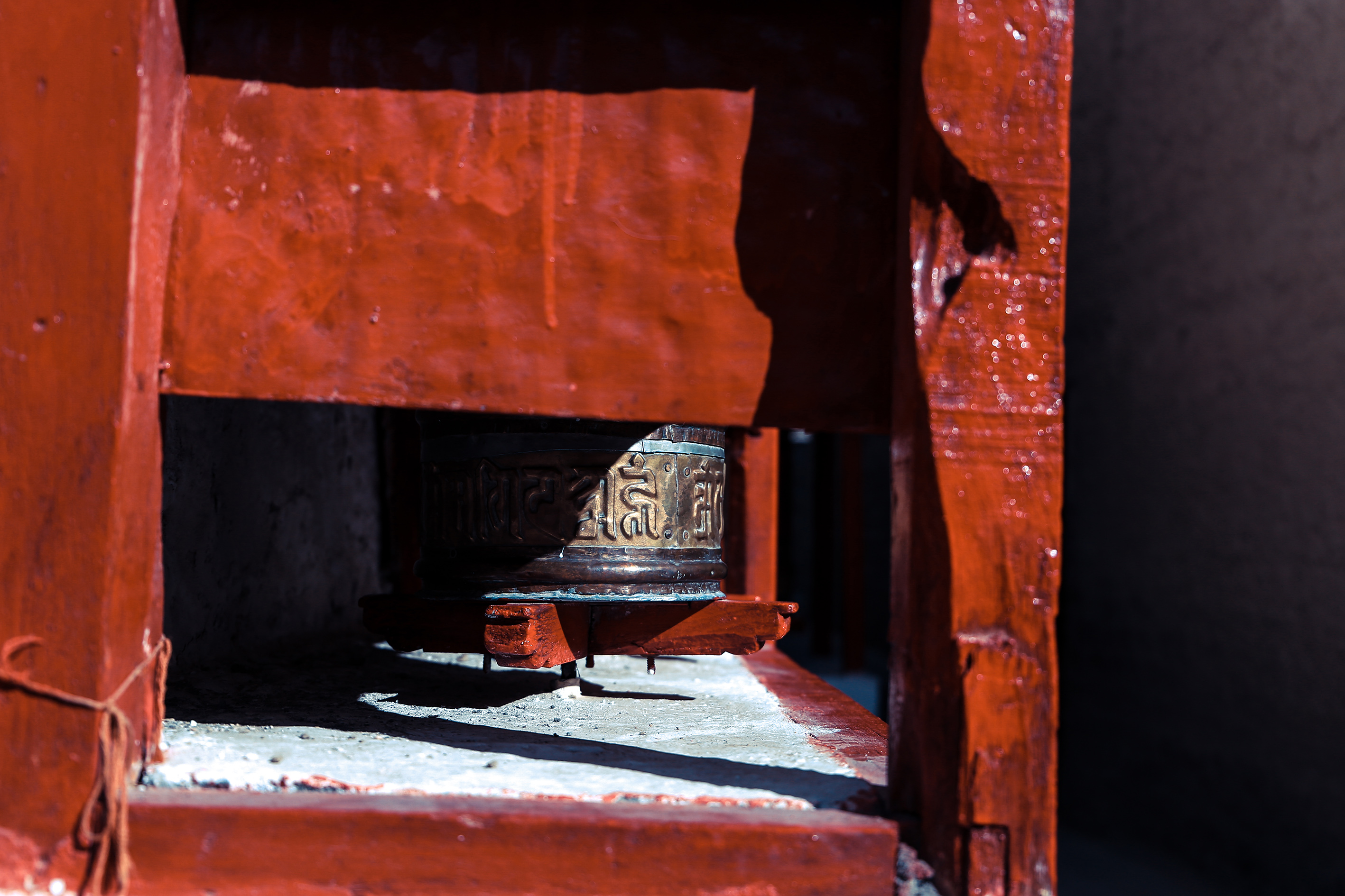 Đi men theo con đường mòn, bước qua những đoạn dốc vẫn còn vương chút băng chưa tan hết, tôi trượt chân đến xoẹt một cái, suýt té ngửa. Ry-u kịp kéo tôi lại trong ánh nhìn lạ lẫm của người dân địa phương. Bước lên một đoạn, chúng tôi bắt gặp một cảnh tượng độc đáo mà sau này chúng tôi nhận ra đây là một nghi thức phổ biến của người bản địa – MANE. “Mane” là tên gọi của một chiếc chuông đặc biệt xuất hiện ở mọi nơi trong thị trấn Leh. Nó có hình trụ tròn, cao, xoay quanh một trục cố định khi có người dùng sức để đẩy. Hết một vòng, mane sẽ đánh dấu bằng một tiếng chuông mà người ta hay gọi là chuông luân hồi.