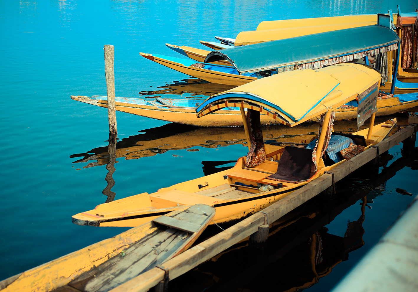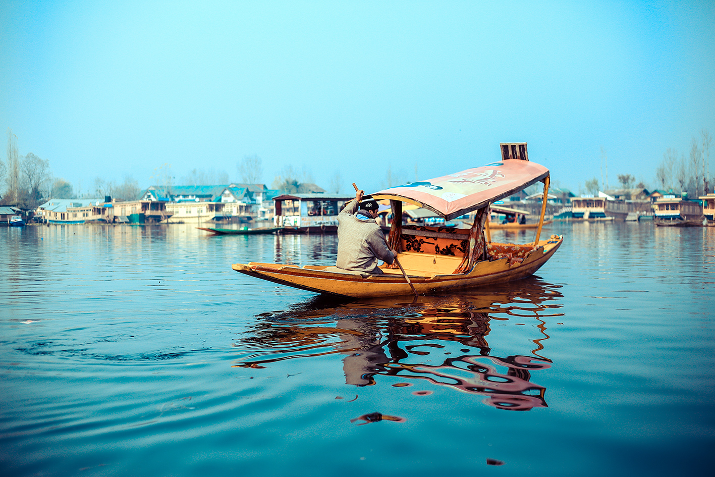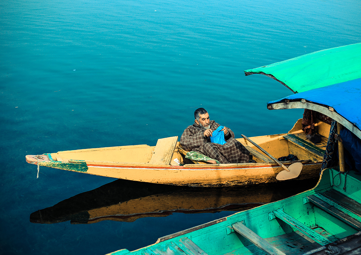 Màu sắc của chủ thể nổi bật trong bối cảnh cũng là một cách làm cho nó trở nên ấn tượng hơn trong bức hình. Ở Srinagar bạn có thể tận dụng tối đa lợi thế này, đặc biệt là mấy chiếc thuyền và mấy ngôi nhà nổi trên mặt nước. Chúng lúc nào cũng sặc sỡ trên nền xanh của trời và mặt nước của hồ Dal Lake.