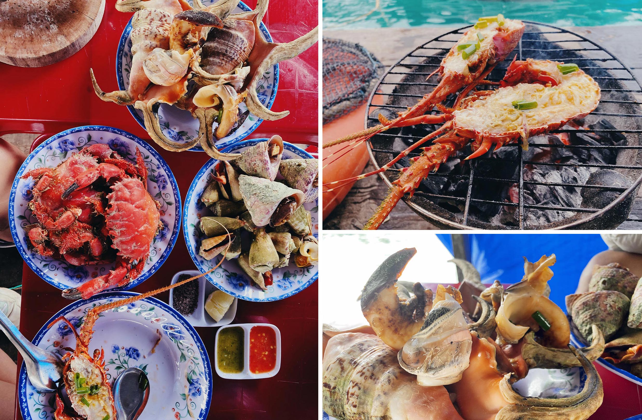 Ngoài ra mọi người có thể liên hệ với homestay để đặt tàu đi sang bè cá ăn hải sản tươi ngon ngoài đó nhé. Bọn mình ăn ở bè “Anh Sáng”. Chi phí ăn ở bè từ khoảng 600K đến 1000K tùy mọi người gọi nhiều hay ít và đi đông hay không. Hải Sản được bắt ngay tại bè và chủ yếu được chế biến theo những kiểu đơn giản như hấp, luộc, nướng mỡ hành,…không tươi!… vì quá tươi!!!;D