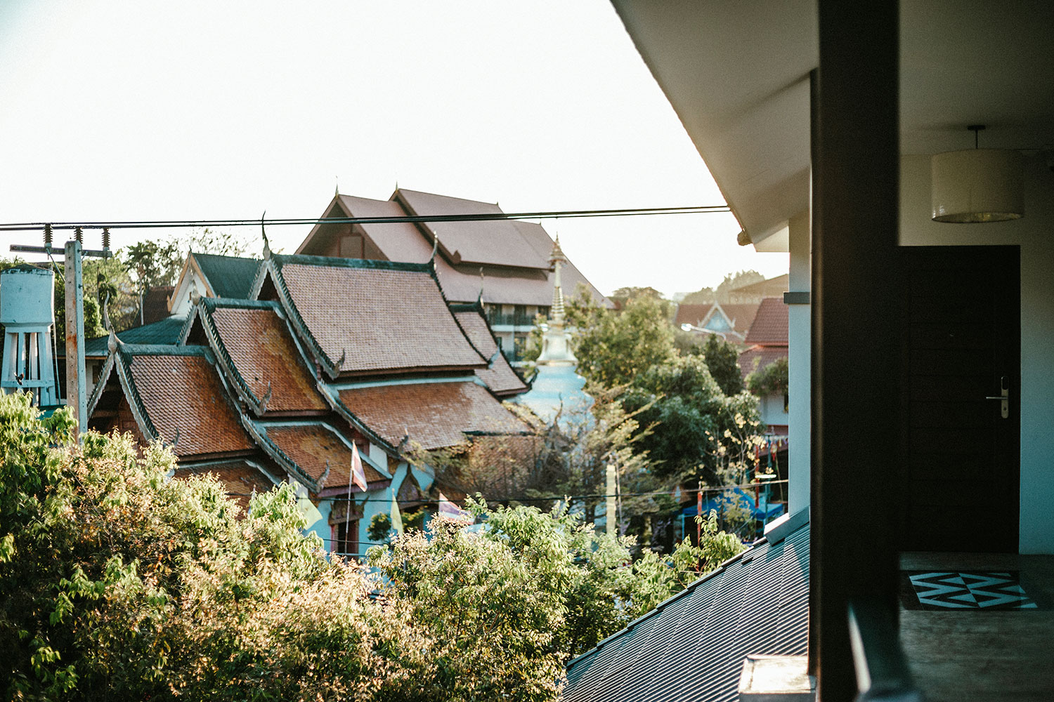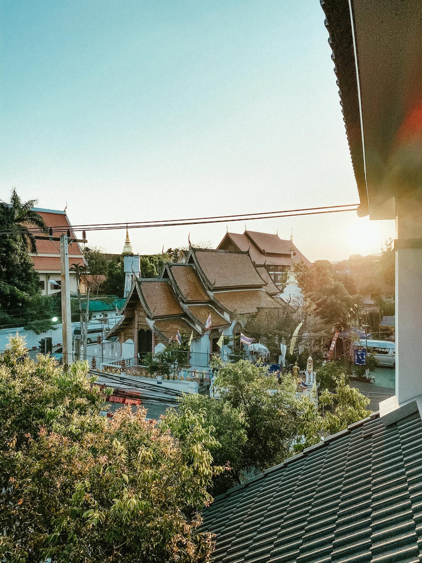 Đứng từ phòng của bọn mình ở tầng trên còn có thể ngắm những mái chùa vàng ở ngay phía bên kia đường đẹp rực rỡ khi hoàng hôn buông xuống. Bọn mình còn rất may mắn khi được hòa vào dòng người đông đúc cùng những món ăn đường phố đậm đà, cay nuốt lưỡi và đậm vị Thái ở khu chợ đêm “Sunday Night Market” siêu dài, siêu nhộn nhịp chỉ cách khách sạn vài bước chân. Thực tình mình không biết đến khu chợ đêm này cho đến khi cất xong đồ và định đi lang thang để tìm chỗ ăn tối. Thế mới nói là có một phần may mắn ở trong đó. Từ khách sạn đi bộ một đoạn là đến Seven Eleven cách đó khoảng 500m. Từ đây bọn mình cũng có thể lang thang và khám phá những tuyến đường xung quanh của khu phố cổ một cách dễ dàng, thuận tiện.