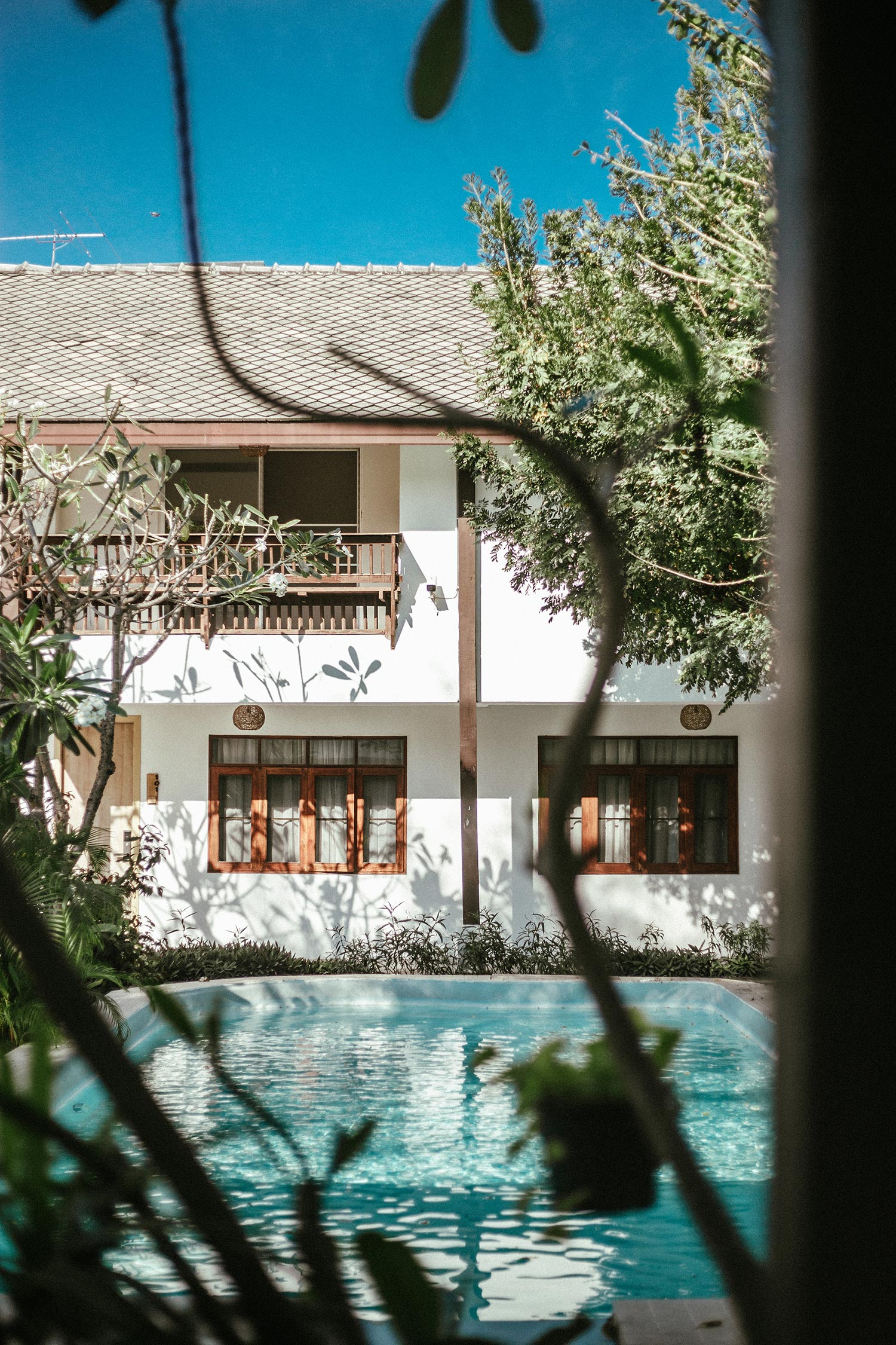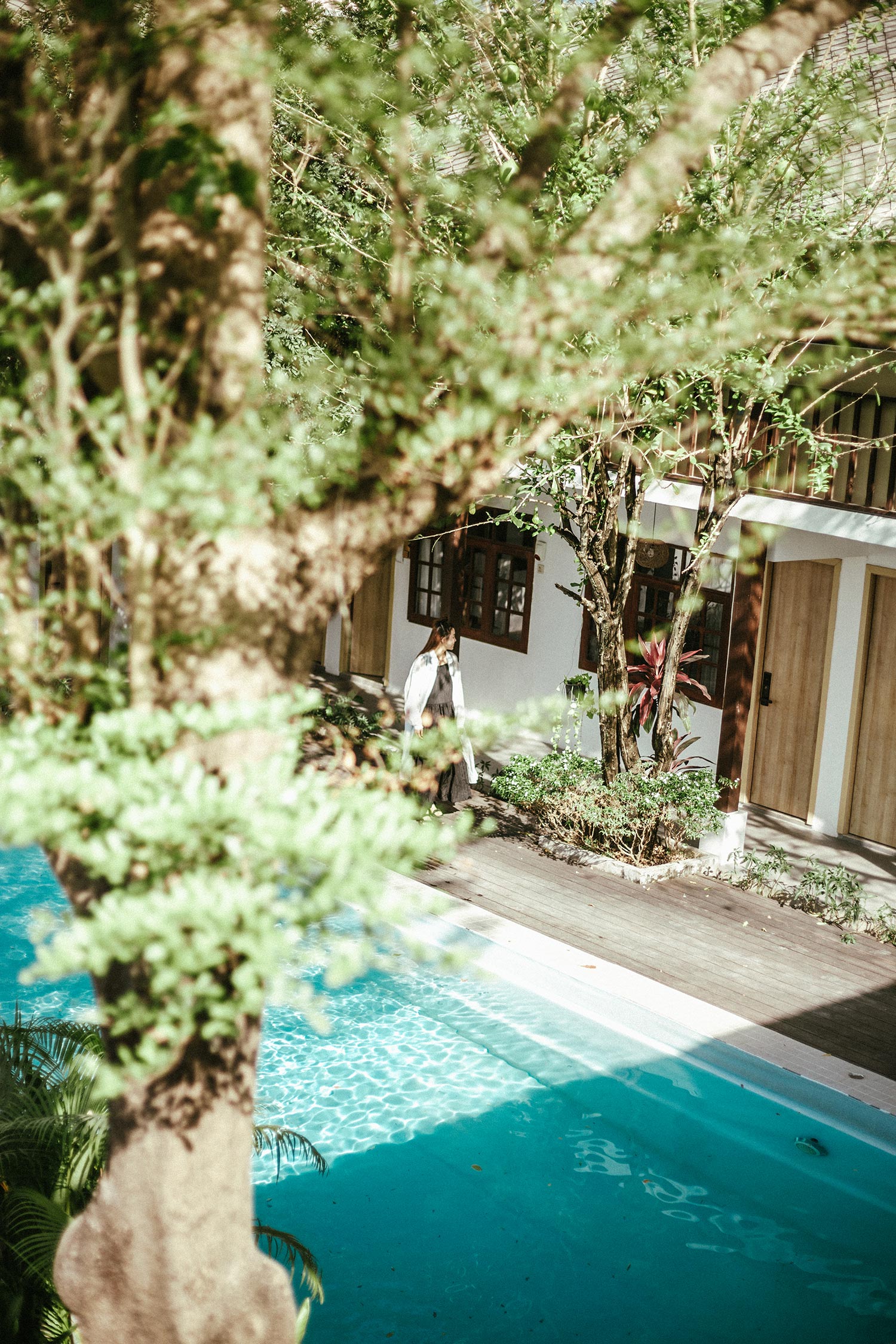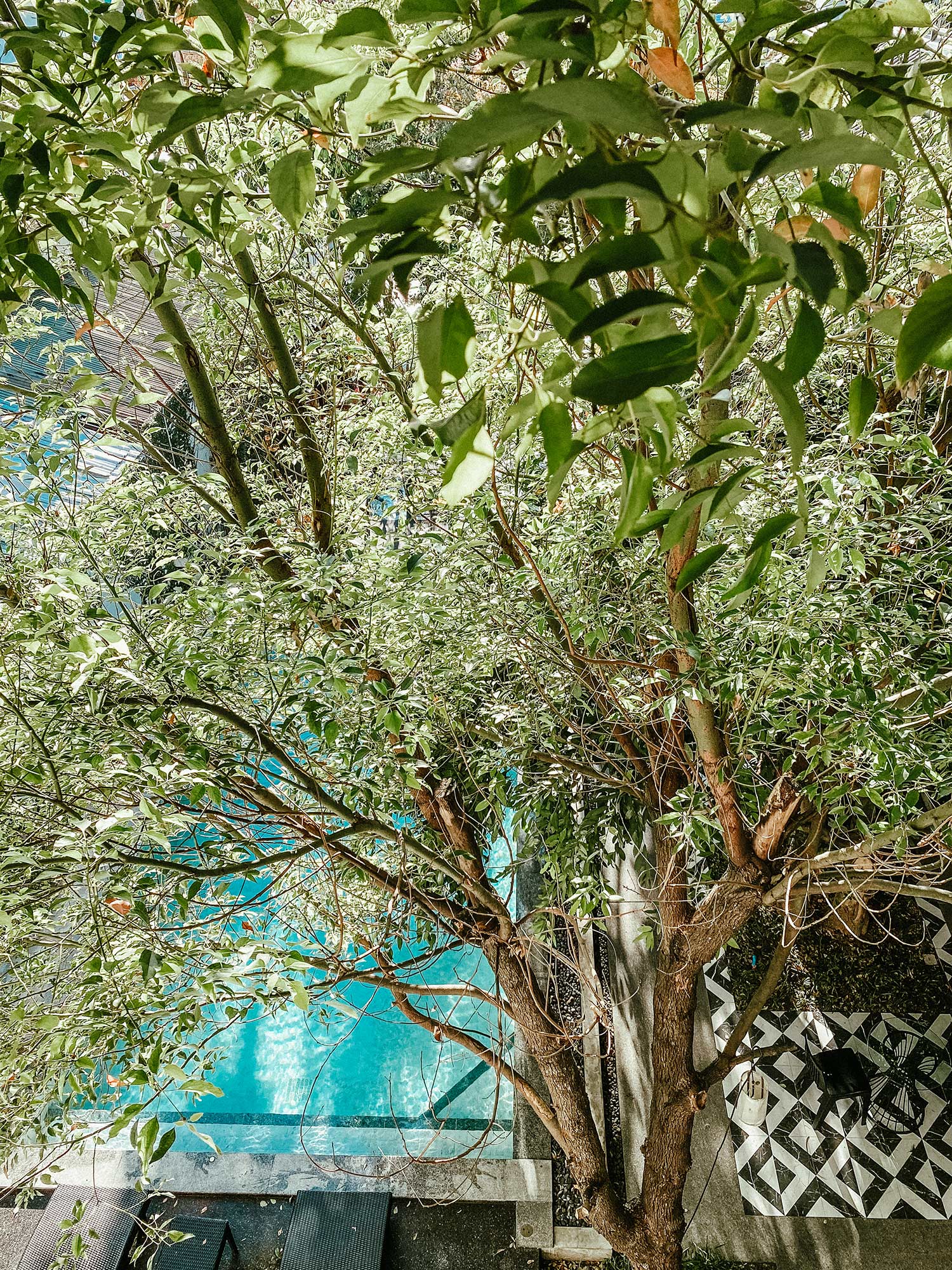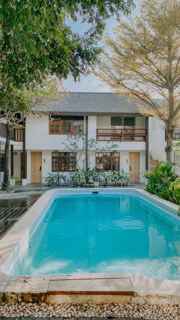 Đây là khách sạn thứ 3 mà bọn mình ở trong chuyến đi này, và cũng là khách sạn mà bọn mình ấn tượng nhất. Khách sạn ở xa trung tâm nên khi đến bọn mình có cảm nhận về tính bản địa khá rõ ràng từ đường phố, xe cộ cho đến không gian xung quanh khách sạn. Có lẽ vì thế mà cái khách sạn mang phong cách minimalism của Nhật này lại như một điểm nhấn trong khu vực với tone màu trắng chiếm gần như toàn bộ không gian kết hợp với nội thất và phụ kiện gỗ đơn giản. Những tấm biển phòng cũng được làm một cách đầy tinh tế và có ý đồ trong việc sắp đặt. Ở giữa khách sạn có một hồ bơi đón nắng, xanh trong như ngọc bích và đẹp tựa trong phim, mỗi tội lá rơi hơi nhiều, nhưng vì cái cây quá đẹp như mùa thu ở Hàn Quốc nên thôi bọn mình chấp nhận, bỏ qua mọi tội lỗi của nó ;D Cứ vài chục phút lại thấy chị phục vụ đi gom lá trên mặt hồ bơi một lần, thấy cũng cực ghê.