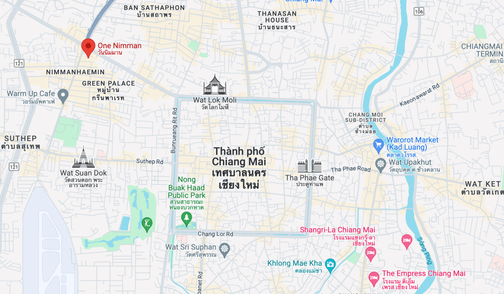 - Khu Nimman: Là khu tấp nập và nhộn nhịp nhất ở Chiang Mai, ở đây tập trung những quán cà phê, trung tâm thương mại, những tổ hợp sáng tạo nghệ thuật mà bất cứ bạn trẻ nào đến với Chiang Mai chắc hẳn cũng muốn ghé qua. Tin mình đi, nếu là một người thích sự nhộn nhịp và những góc sống ảo chất như ở trời Âu hay Nhật Bản, Hàn Quốc thu nhỏ thì Nimmanhaemin chắc chắn sẽ không làm bạn thất vọng.