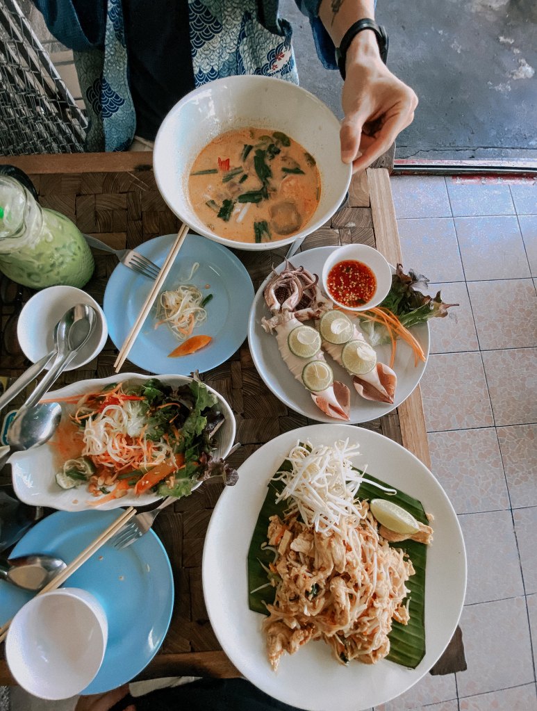 Sau khoảng hai tiếng được đắm mình trong những chất liệu nghệ thuật độc đáo, bọn mình quay trở về thực tại và xoa dịu cơn đói bằng việc ghé đến một quán ăn nhỏ không có nhiều bài review nhưng lại được người dân địa phương có vẻ ưu ái nhắc đến khá nhiều, đó là Kat’s Kitchen. Đây là một quán mà mọi người hãy dành để ghé đến khi bụng đã thật là đói nhé, hoặc để dành cho một hôm nào mà mọi người hoạt động nhiều nhất, cần nạp năng lượng nhất thì hãy ghé vì đặc trưng của quán này là làm đồ cực kỳ đầy đặn, đầy đặn nhất trong các quán mà bọn mình ăn từ hôm đầu tiên, đến mức mà bọn mình đã suýt bỏ lại nửa đĩa Path Thái mà nửa đĩa ấy chắc phải bằng một đĩa bọn mình ăn ở mấy chỗ khác. Mà ngon nhé! Đồ khá là vừa miệng, từ TomYum cho đến gỏi hay Path Thái đều ổn.