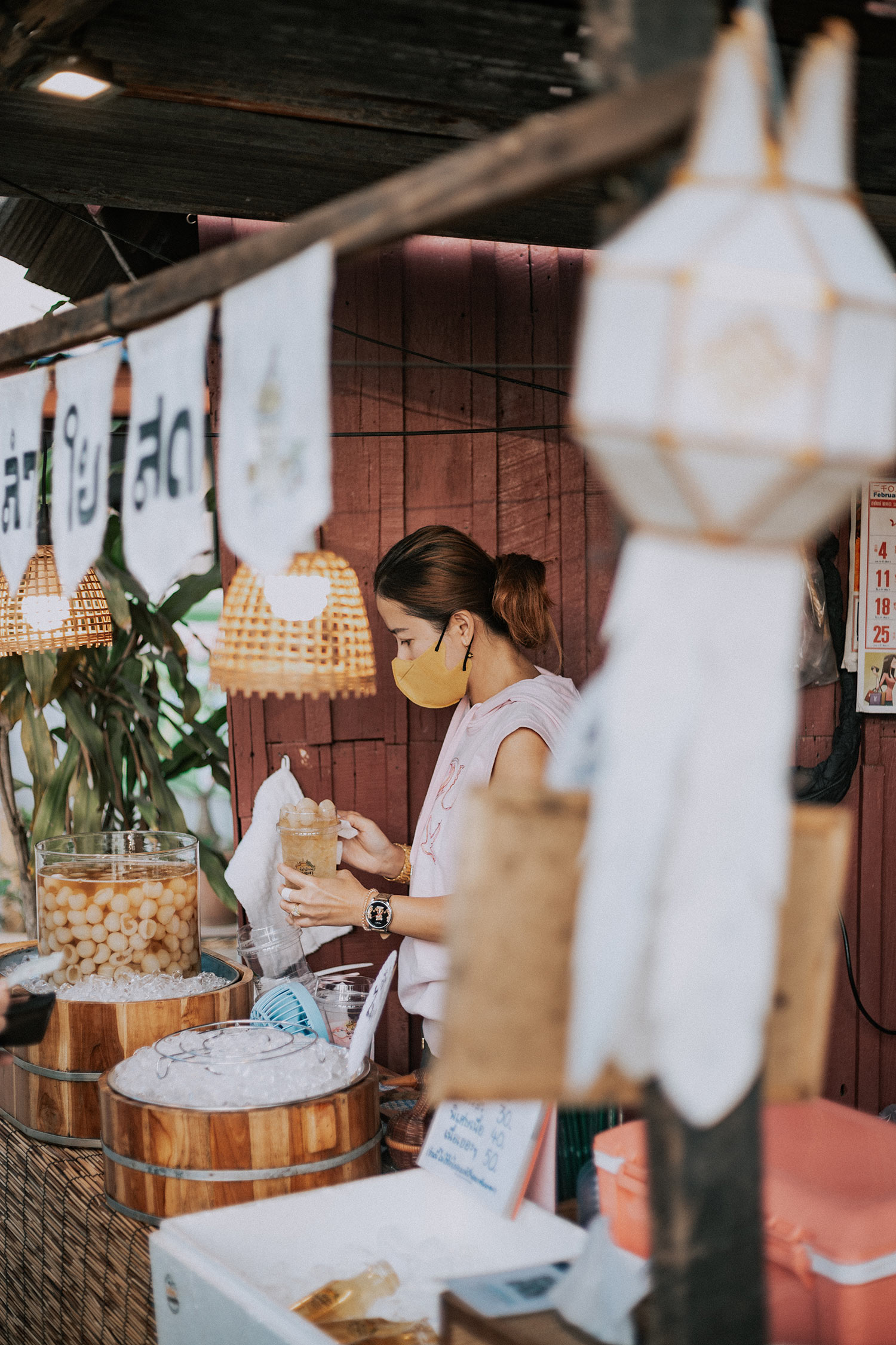Đấy là nguồn gốc của khu chợ địa phương này mà bọn mình tìm hiểu được, bởi thế bọn mình càng thấy ấn tượng và thích thú hơn. Cho dù chỉ là một đoạn ngắn ở hai bên bờ kênh, nhưng bạn sẽ thấy khá chill vì khung cảnh yên bình của nó. Trong khu chợ này có một món thức uống siêu ngon và bổ mà mọi người phải thử, đấy là món Trà Long Nhãn được ngâm và đựng trong một cái hũ to. Vị ngọt thanh và đặc biệt là rất nhiều Long Nhãn, một cốc múc ra chắc cũng phải đến hơn chục quả nhãn mà chỉ có 50 Bath/1 cốc thôi.